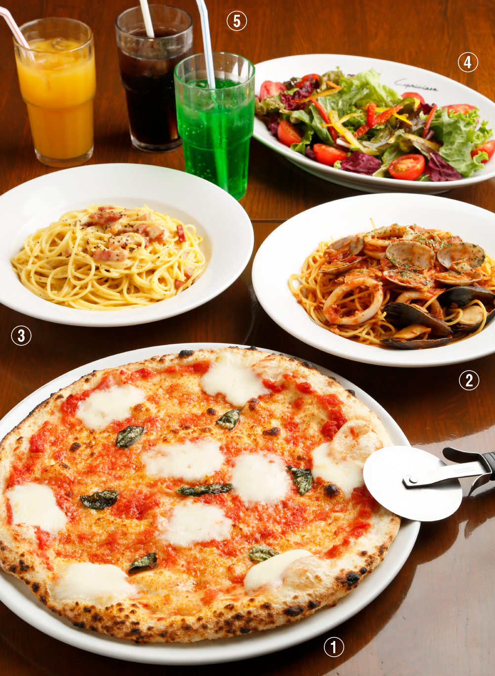①マルゲリータ ②ペスカトーレ 漁師風トマトソース ③カルボナーラ ④いろいろ野菜の菜園風サラダ ⑤その他、オレンジジュース、メロンソーダ、コカ・コーラ