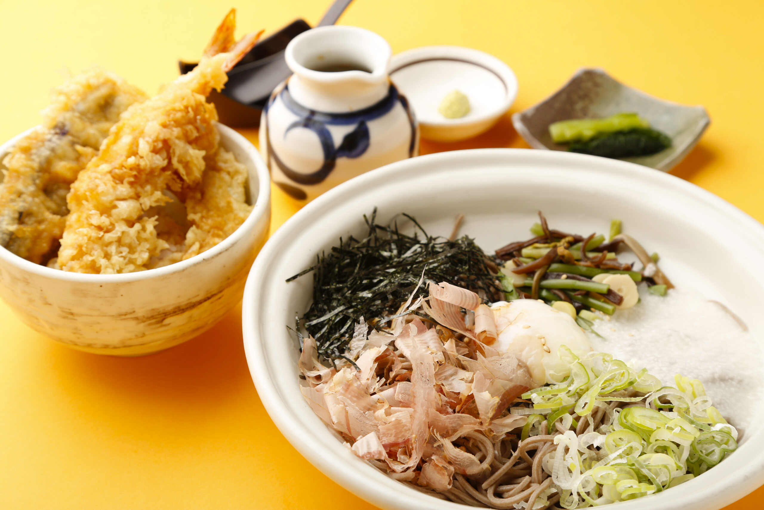 運動で疲れた身体に嬉しい、さっぱりとしたそばメニュー。夏季から続いて人気のこちらのメニューは、山菜やとろろ、大根おろし、温泉たまご、なめこ、梅干しからそばの具材を3種選べます。その上、大海老を含む3種の天ぷらが載ったミニ天丼付きの豪華なセットです。