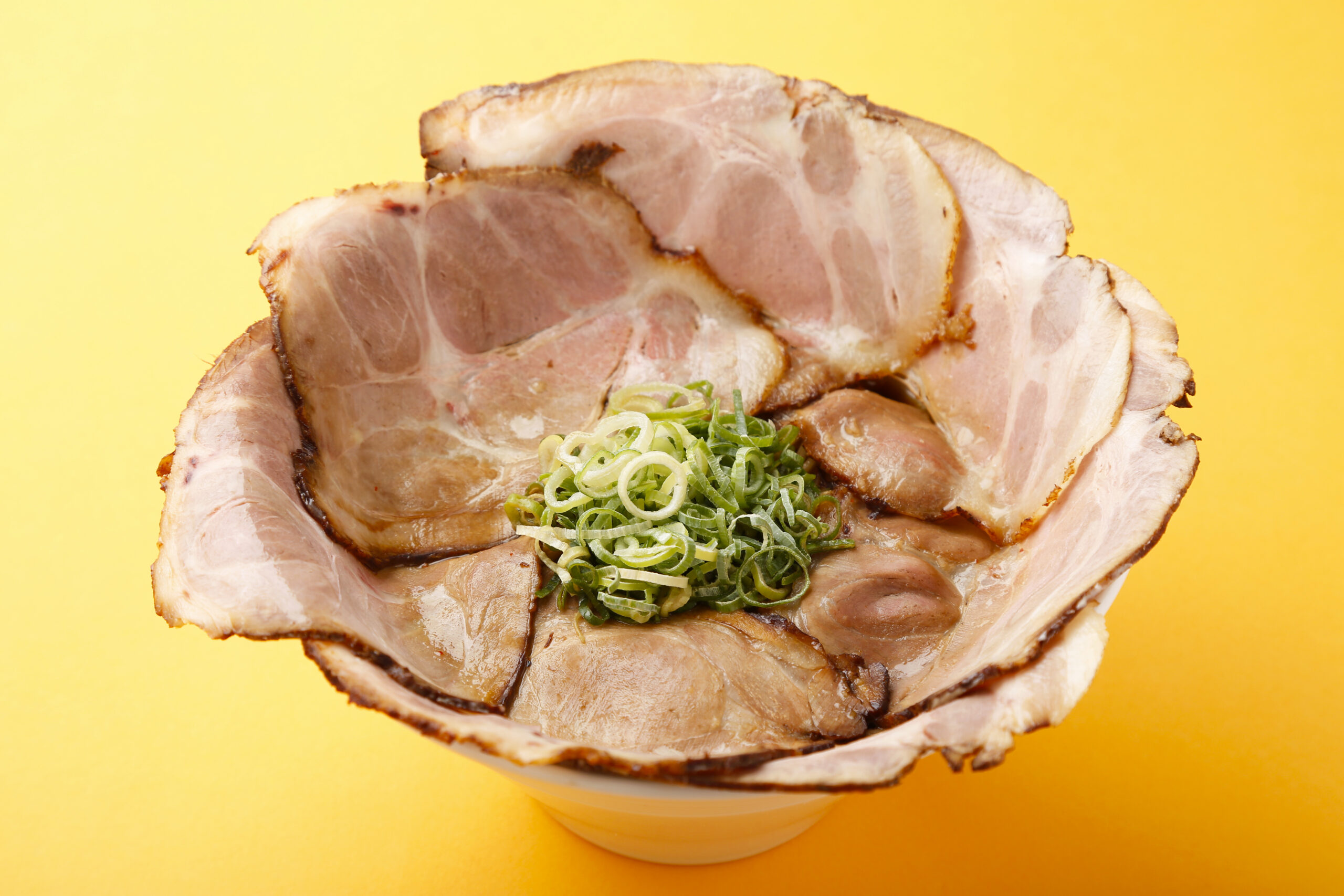 ラーメンに「+400円」で追加できる『肉盛りトッピング』。約15cmの大ぶりチャーシューは低温長時間仕上げでジューシーな味わい。肩ロースを使っているので、赤身の旨みが活きて意外にあっさりと味わえるのもポイント。6枚ドーンと盛り込まれるので、腹ペコさんにはもってこいなトッピングメニューです。