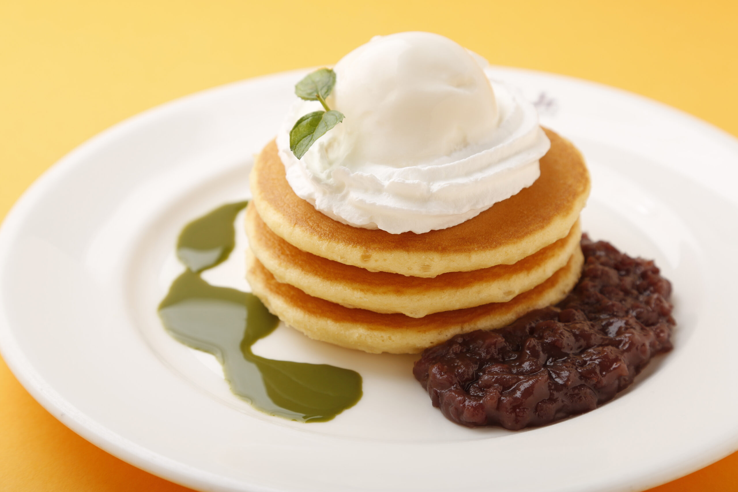 ふわふわの三段生地に、ホイップクリームと北海道あずきと抹茶ソースを添えた一品は、和の風味が心地よいご褒美スイーツです。ひと皿に盛り込まれる様々な要素で、いろんな味わいが楽しめるのも嬉しいポイント。ボリュームもご褒美級です!