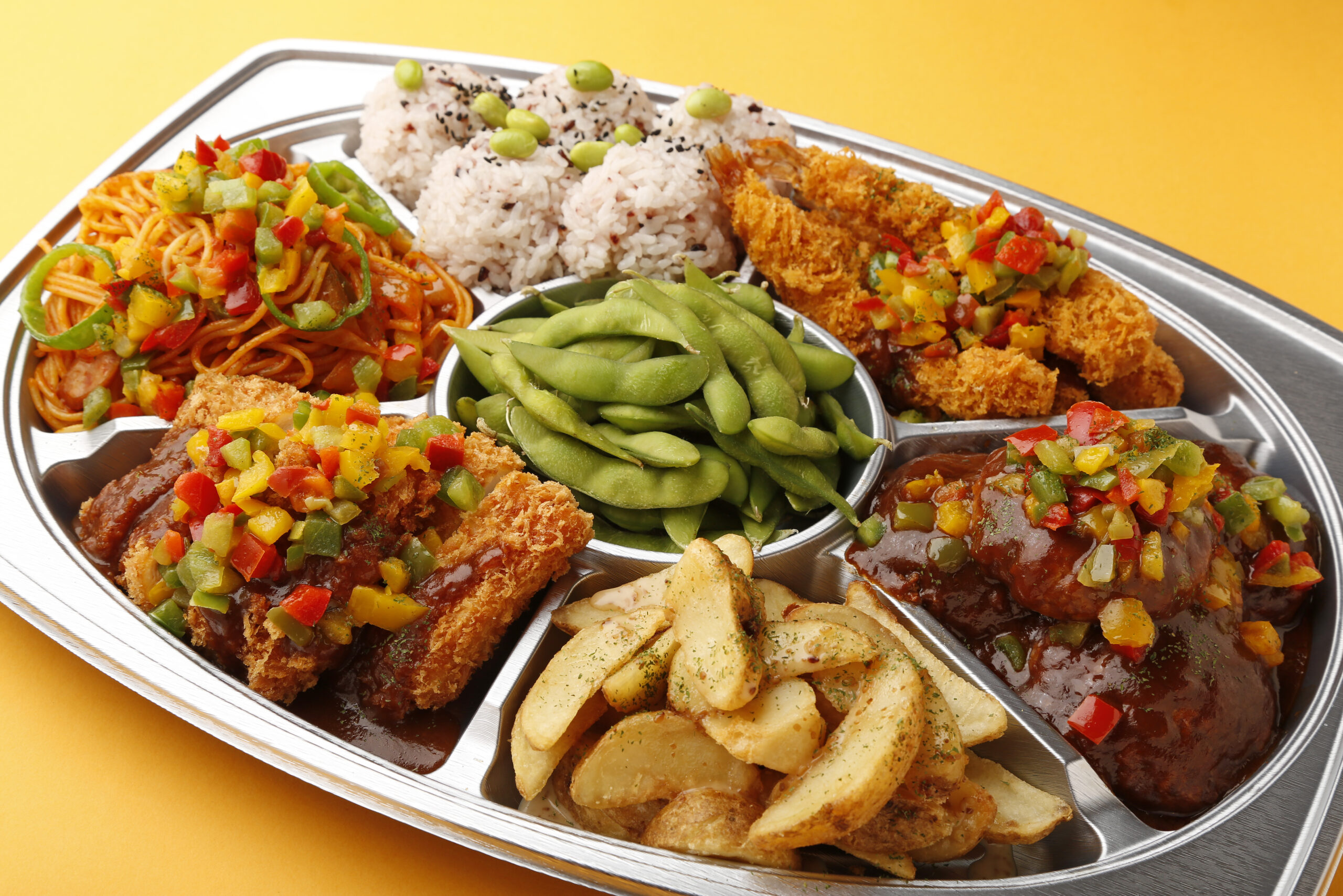 ※内容:フレンチフライ、チキンカツ、ナポリタンスパゲティ、黒米ご飯おにぎり、海老フライ、ハンバーグ、枝豆