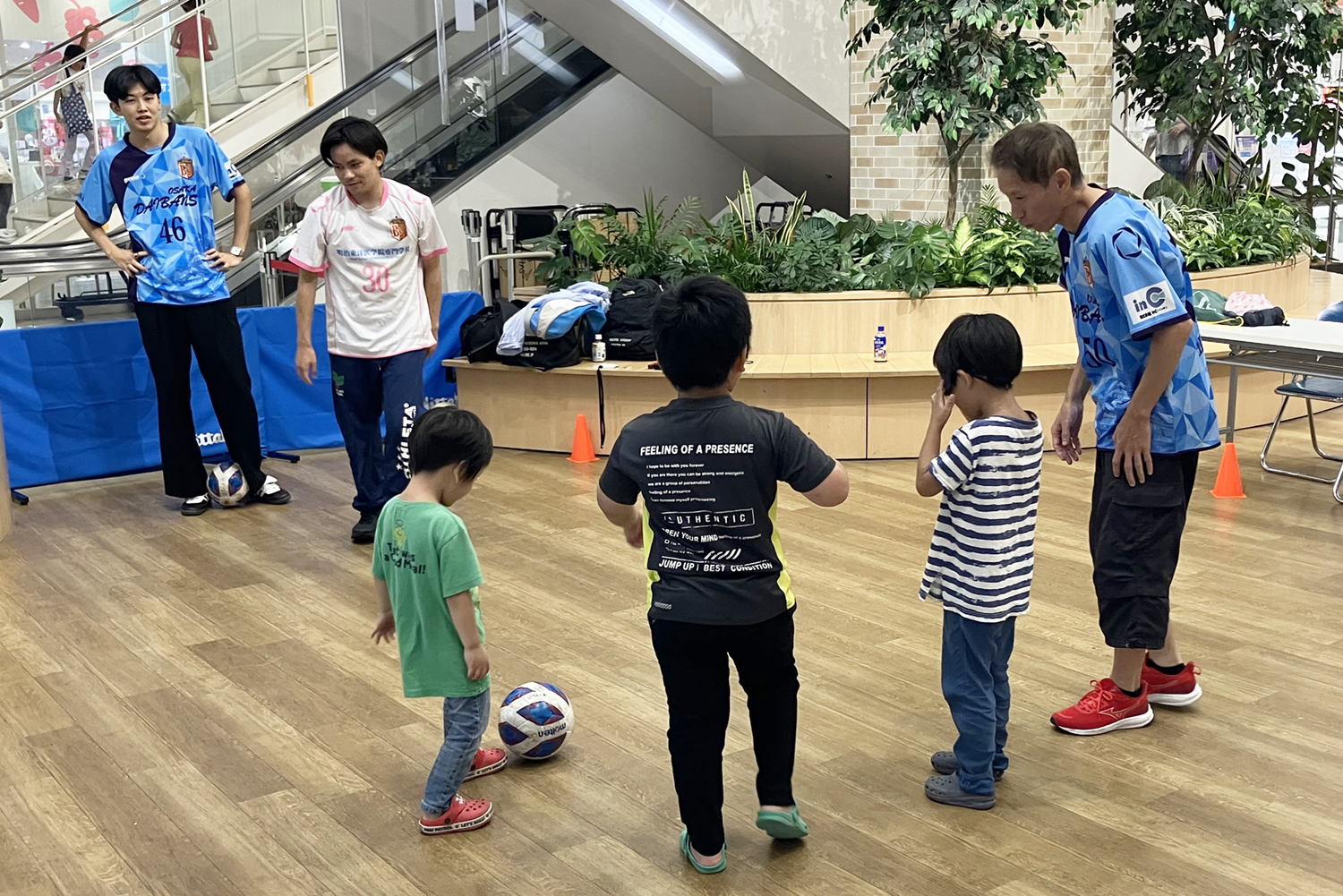 パラリンピックの種目でもある「ブラインドサッカー®」コーナーでは、実際にアイマスクをつけての体験です。初めは戸惑っていた子どもたちが大阪ダイバンズのみなさまのサポートで次第に音をつかみながら身体を動かしていきます。歩く、ボールを蹴る、声を出し合いながらパスをする等少しずつ確かな進捗に「貴重な経験ができてよかった」といった声もいただけるコーナー展開となりました。