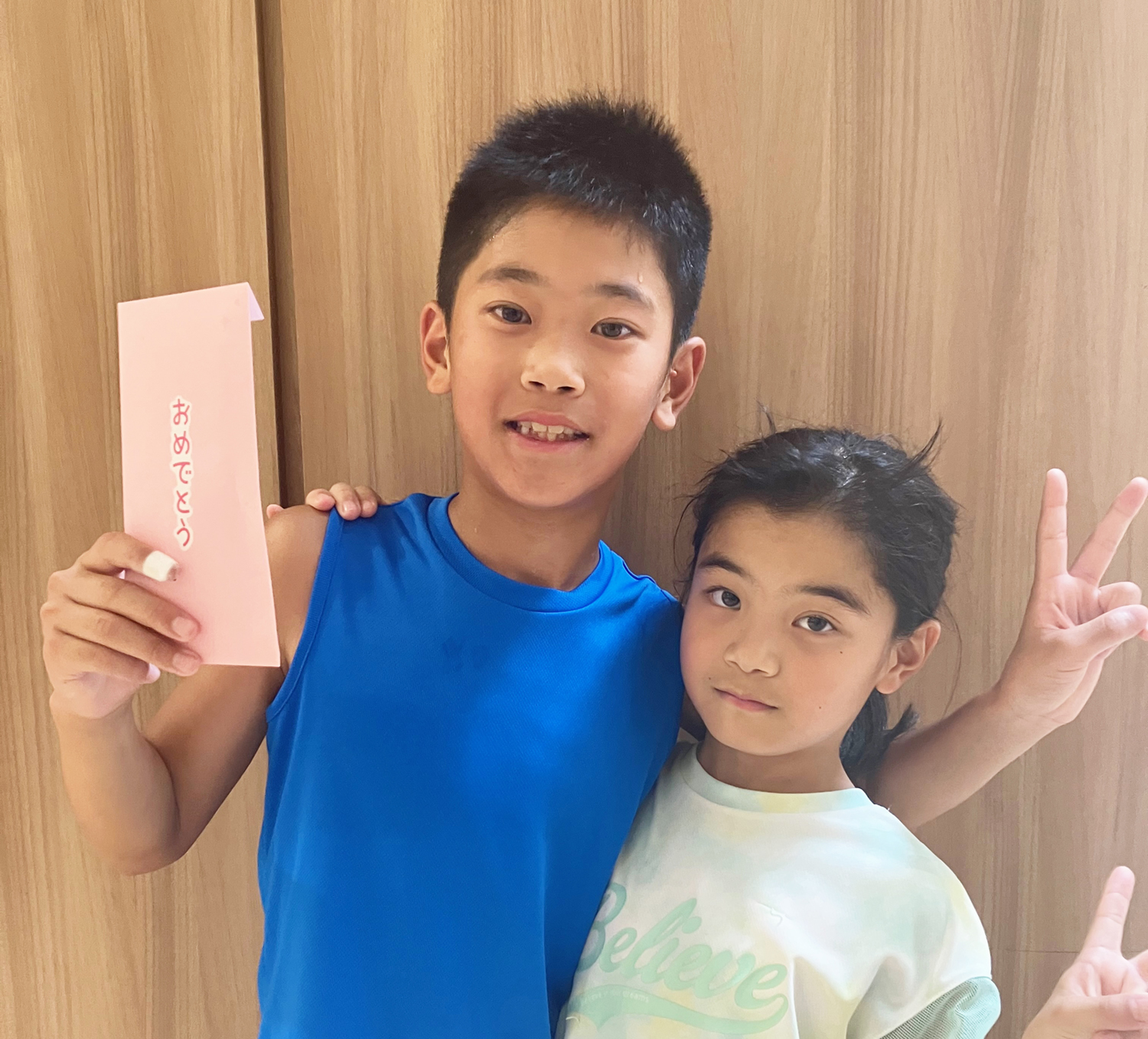 トライアスロンで鍛えた身体を活かして「小学生の部」で優勝したシュウゴさん(10才)。優勝した瞬間に傍らで応援を続けてくれたお友だちたちと大歓喜! 妹のイロハさん(8才)も一緒に参加してベストパフォーマンスを見せてくれました。