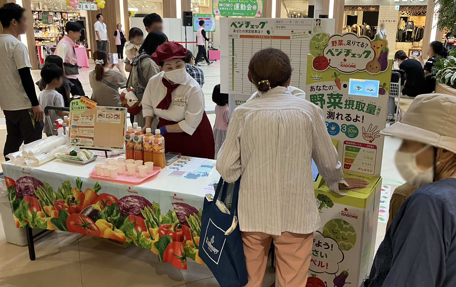 野菜の推定摂取量を手の平で測るベジチェックコーナーにも多くの方が足を運んでいました。普段の食生活の成績表を4段階で評価されるようで…ドキドキの測定です。もしもガッカリな結果だったとしても改善策が分かるように「1日の野菜摂取目標量350g」の現物を見せてくれたり、手軽に摂れる野菜ジュースの試飲も用意されていました!