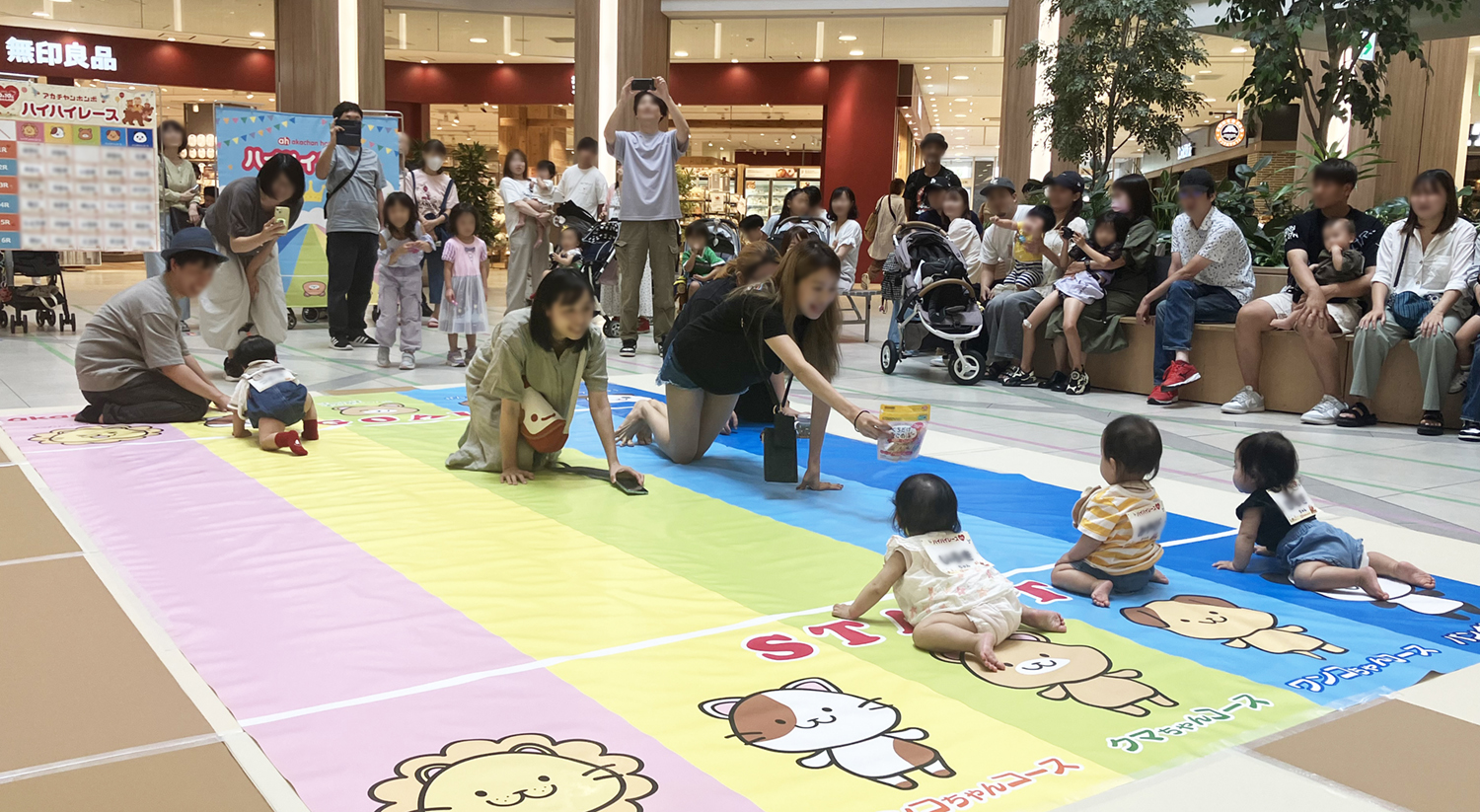 ゴールを目指して可愛らしい選手たちがハイハイする「ハイハイレース」は会場中を笑顔で満たしてくれました。普段は「触っちゃダメ!」なTVリモコンやお菓子を使って前へ前へと誘導!あくまでも自分のペースで走行する選手たちと、ママやパパとのやり取りが笑みを誘うワンシーンを連発。最後まで頑張ったママ&パパと選手全員が優勝者です!