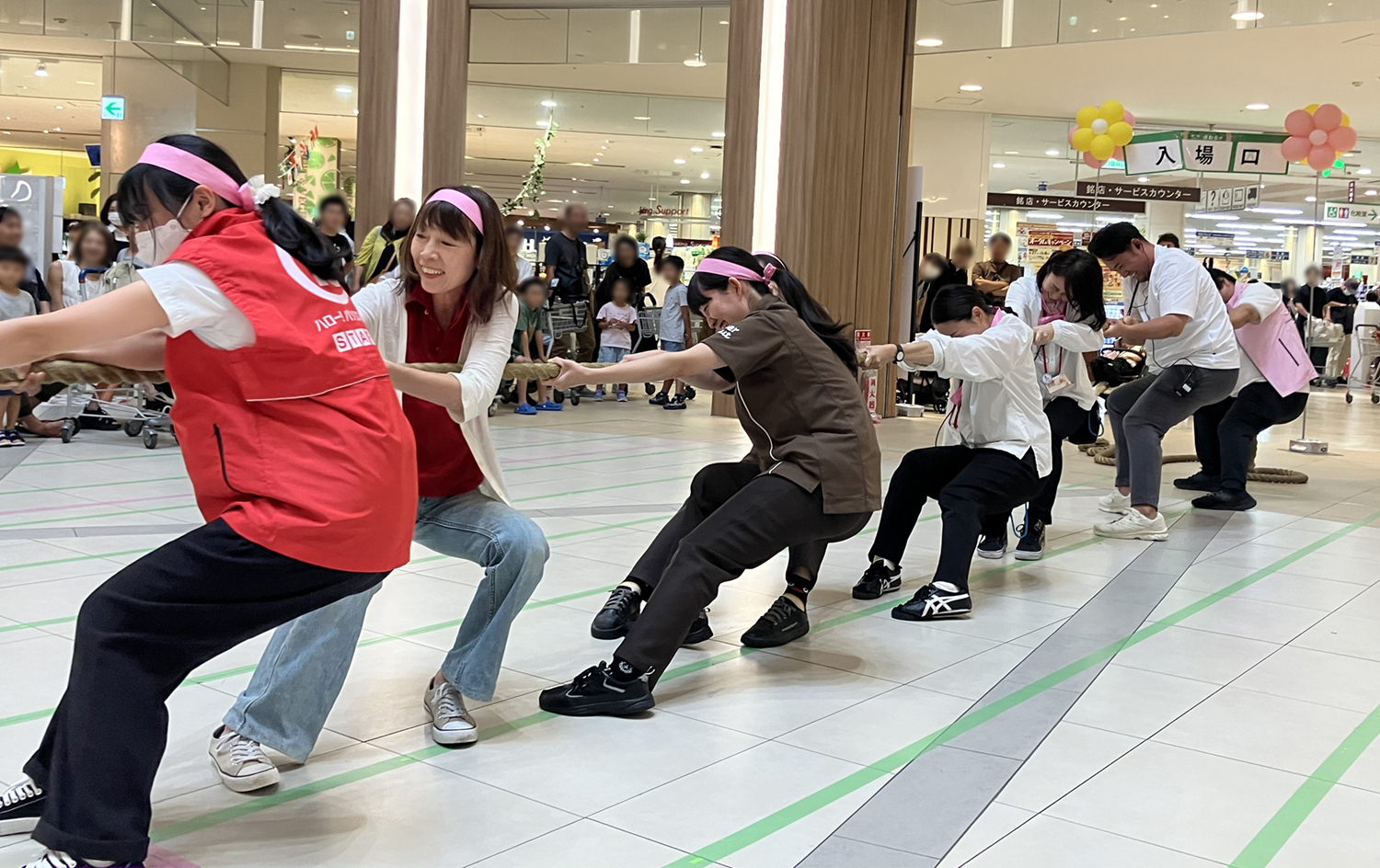 昨年も白熱の対決シーンにアトリウム中が湧き上がった「みんなで『つな引き』。パワーはもちろんチームワークも試される、まさに“みんなで”勝ち取る競技は今年も大人気。観るだけではなく「自分も挑んでみたい!」気持ちをいっぱいにした選手たちが集まって、小学生以下の部と中学生以上の部で開催しました。2Fにまで固唾を飲んで見守る方々が溢れて、吹き抜けにまで声援の声が響き上がっていました!