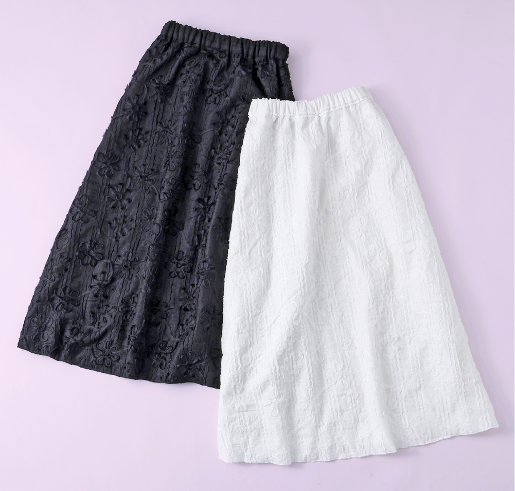 ●花柄テープ刺繍フレアスカート 各6,490円