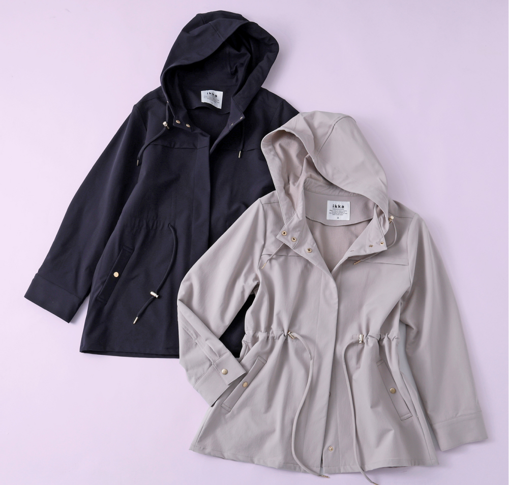 マウンテンパーカーのデザインをベースにしながら、シルエットや金ボタンがエレガントな雰囲気の一着。撥水加工と伸縮性で、急な雨や長距離移動にも安心です。ほどよいハリ感があり、キレイめスタイルにもマッチします。花粉リリース加工もあるので、春のおでかけが不安な方にもおすすめです。