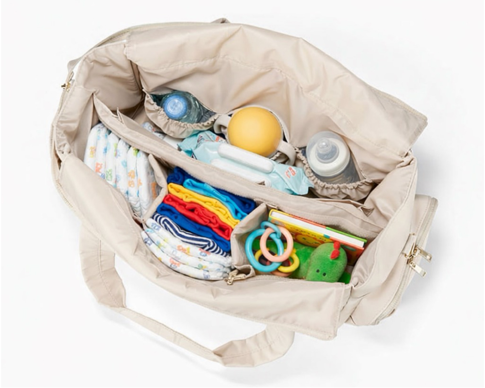 耐久性に優れる丈夫な生地で、大きく広がる仕様の開口部が大助かり!レジャーシートや水筒、かさばるオムツ等の持ち物が取り出しやすく仕舞いやすい!