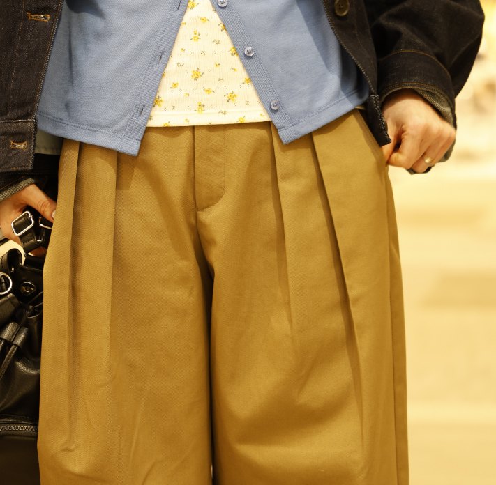 主役は立体感と丸みのあるボリューミーなバレルパンツ。トップスとのメリハリも良く、フロントに長めに入ったインタックがウエストをキレイに見せてくれます。ハリ感のあるチノ生地だから、カジュアルだけどキレイ目な印象に。